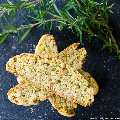 But believe me, it’s not a complaint. I had a fantastic time in San Francisco, catching up with folks I see once a year. Italian and Cal-Italian dominated our restaurant choices over the course of the week and Tim, the friend we hung out with at the market, and I chatted about lavender biscotti, so naturally I’m diving back into posting with these little Italian cookies on the brain. So, Rosemary, Cornmeal and Pine Nut biscotti.